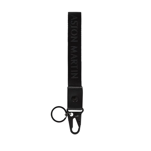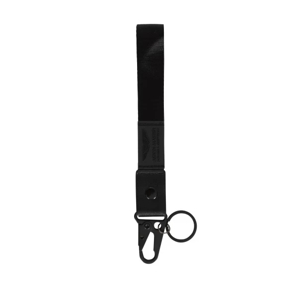 The black key ring from the Aston Martin F1 Team made of polyester. The fob with snap hook has the team logo in embossed leather sewn on one side. On the other side is the Aston Martin logo.
