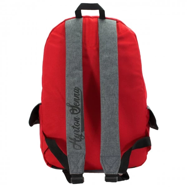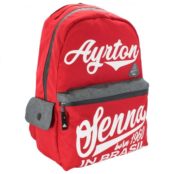 Red Ayrton Senna backpack with big writing “Ayrton Senna – born 1960 in Brasil”. The bag has a large main compartment as well as a small compartment with zipper on the front. Design elements such as a small batch and two side pockets with snap fasteners decorate the backpack. The shoulder straps are adjustable and padded for optimum comfort.