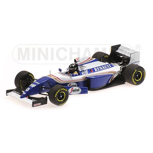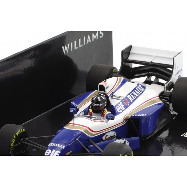 The miniature car Williams FW16B in scale 1:43 shows Damon Hill at the Belgian GP of Formula 1 in 1994.