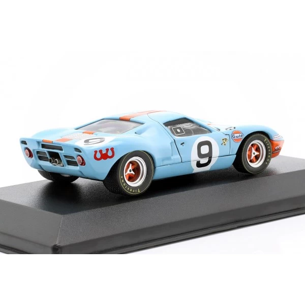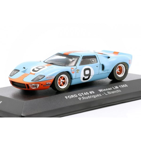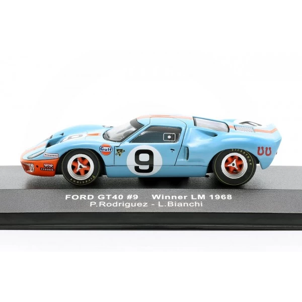 Model car of the Gulf Ford GT 40 on a scale of 1/43. The drivers Rodriguez and Bianchi were able to win the 24H race of Le Mans 1968 with the Ford in Gulf livery.