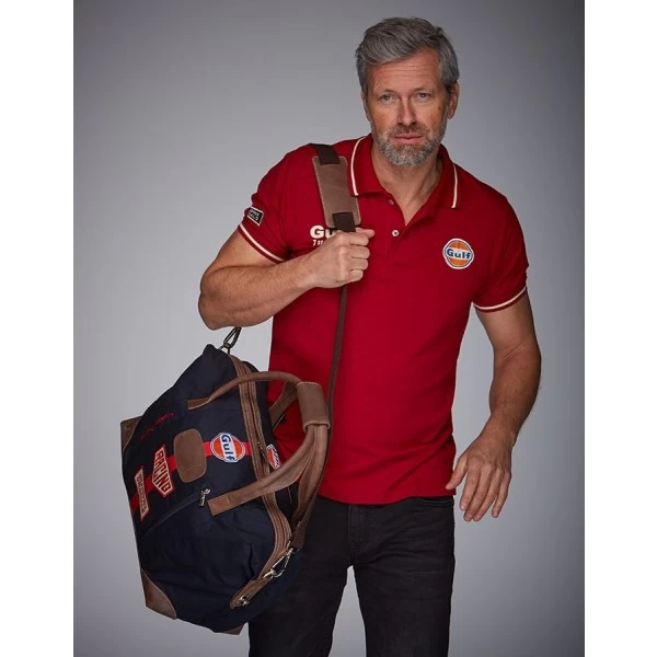 This dark blue travel bag from the Gulf racing team is presented on the occasion of the 50th anniversary of Le Mans. It has a central red stripe, inspired by the overall worn by Steve McQueen at the beginning of the shooting of “Le Mans”. Robust material mix and great workmanship with high-quality embroidery.