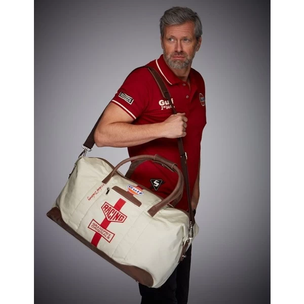 This travel bag with the central red stripe from the racing team Gulf is inspired by the overall Steve McQueen wore at the beginning of the shooting of “Le Mans”. It will be presented at the 50th anniversary of the film. Robust material mix and great workmanship provided with high-quality embroidery.
