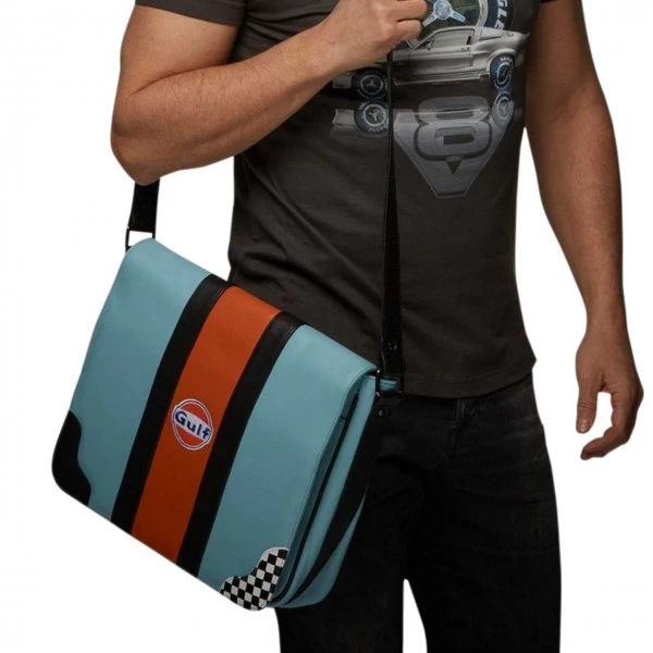 Casual Gulf shoulder bag made of leather in the well-known brand colours blue and orange with integrated Gulf logo. The bag has several inside pockets and an integrated mobile phone pocket. The inner lining is made of sturdy cotton cloth.