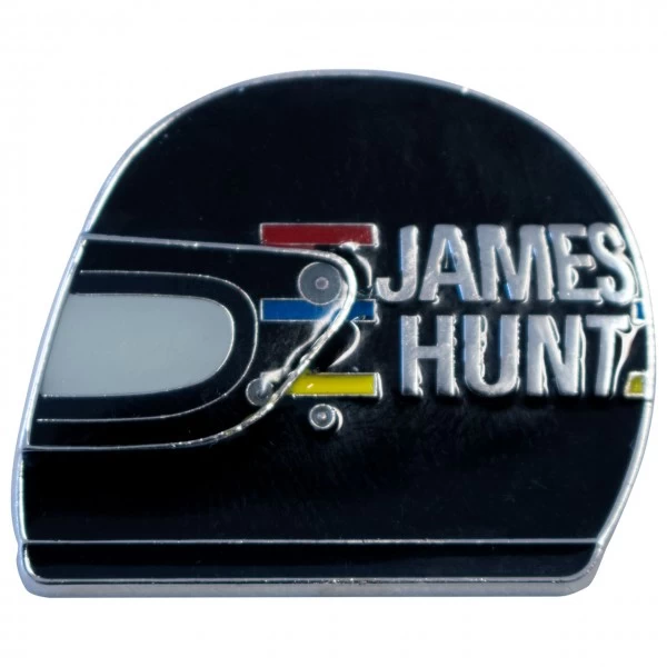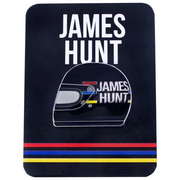 The black James Hunt Pin is dedicated to his World Champion title from 1976 and shows the three-coloured helmet design following the Wellington College colours. These colours are James Hunt trademarks and have been immortalized on his helmet.