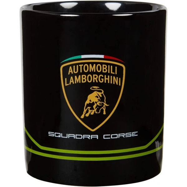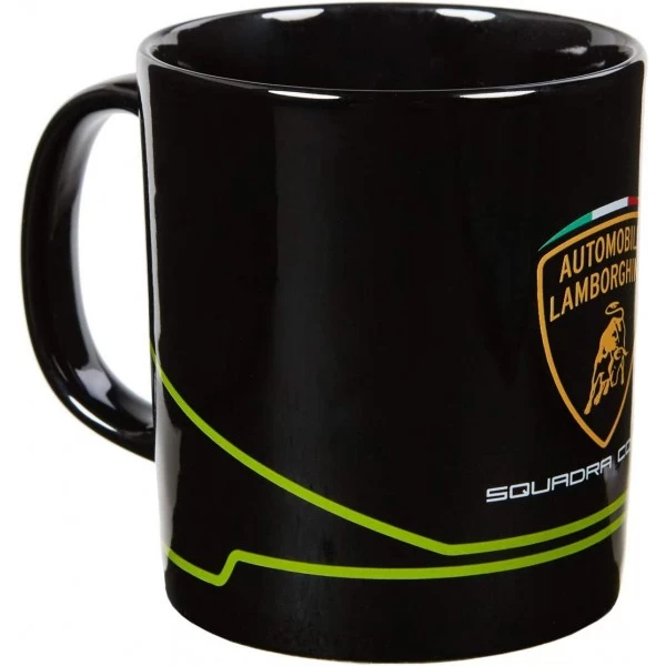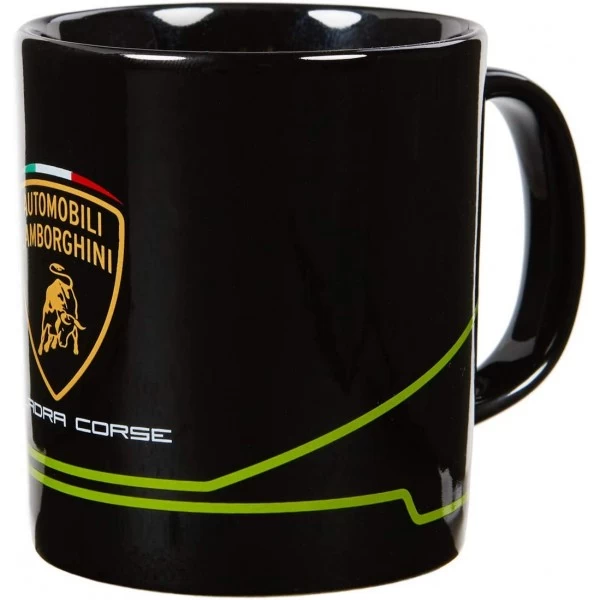 The black mug is part of the Lamborghini Team Collection, which includes other accessories such as caps, stickers or key rings.