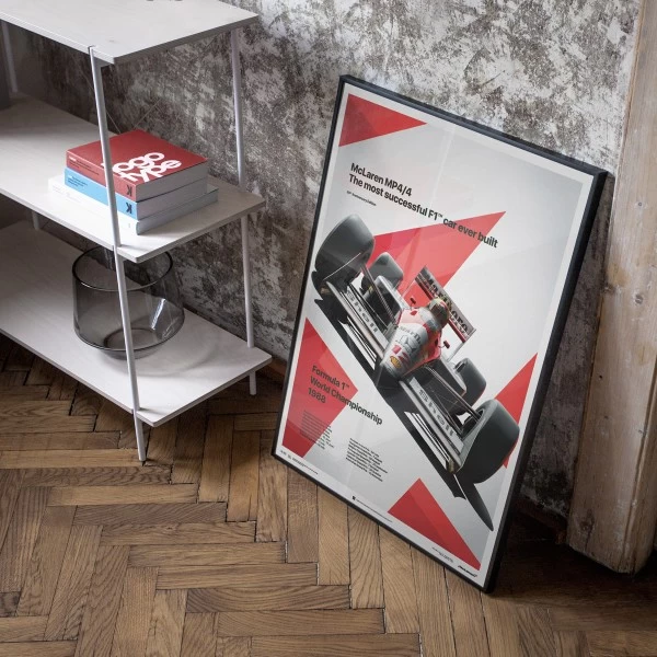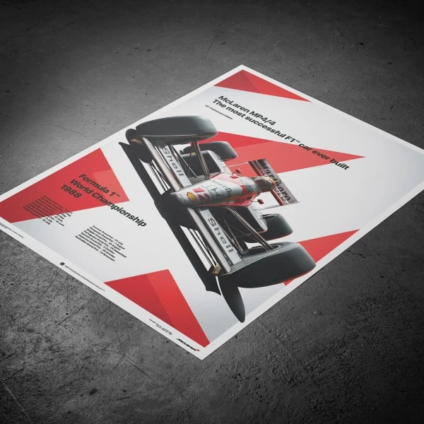 This Ayrton Senna poster is dedicated to the 30th anniversary of his first World Championship victory. In cooperation with Automobilist™, several design posters with Ayrton Senna’s greatest successes have been designed. The poster shown here is dedicated to Senna’s first title win in 1988 with Team McLaren. The artwork shows Senna’s McLaren MP4/4 with its distinctive red and white paint.