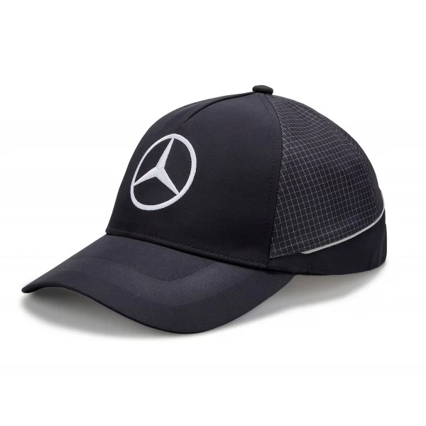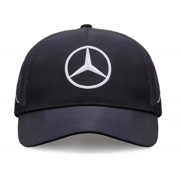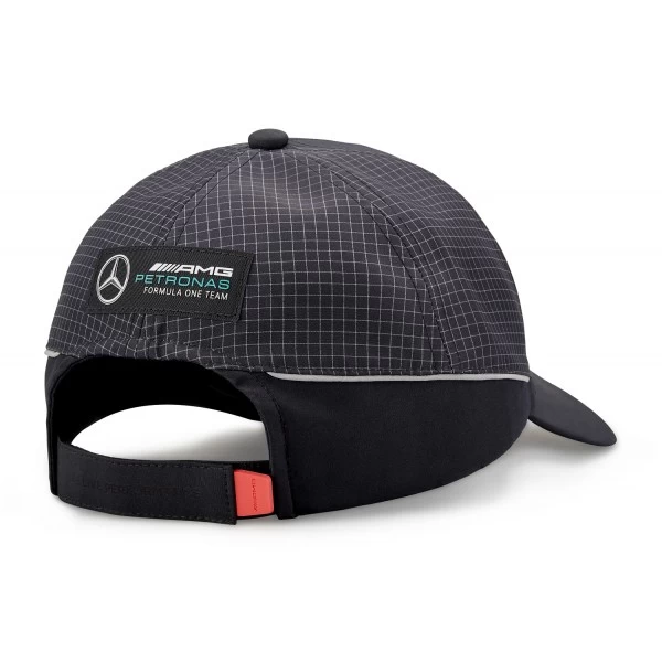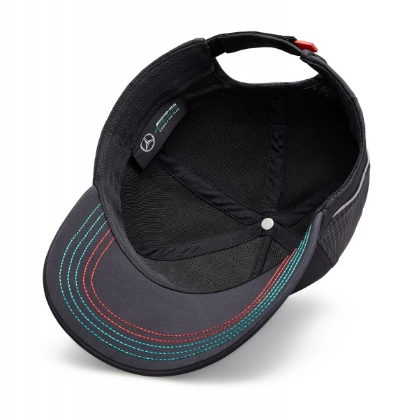 The embroidery on the front shows the Mercedes emblem, the back features the team logo. Another eye-catcher is the design in a grid pattern, which extends over the entire cap. The Velcro fastener on the back allows the size of the cap to be individually adjusted.