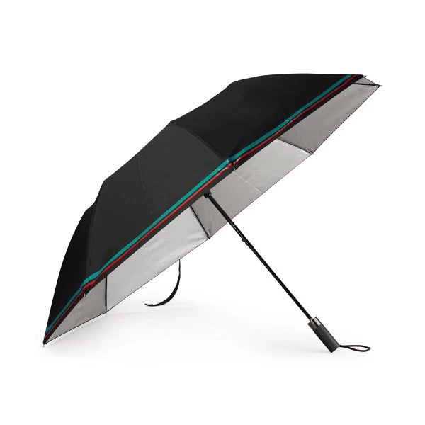 The black umbrella from the Mercedes-AMG Petronas fan collection. In addition to the Mercedes-AMG Petronas team logo, there are also printed stripes in the team colours all around. The umbrella has a comfortable handle with an integrated push button to open the umbrella. An additional storage bag is included with the umbrella.