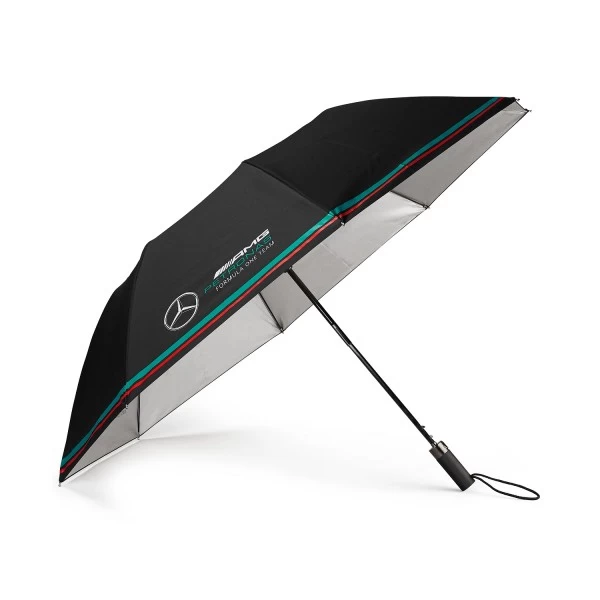 The umbrella in black is part of the official Mercedes-AMG Petronas fan collection, which includes accessories as well as other products such as T-shirts, jumpers, jackets and more with team branding.