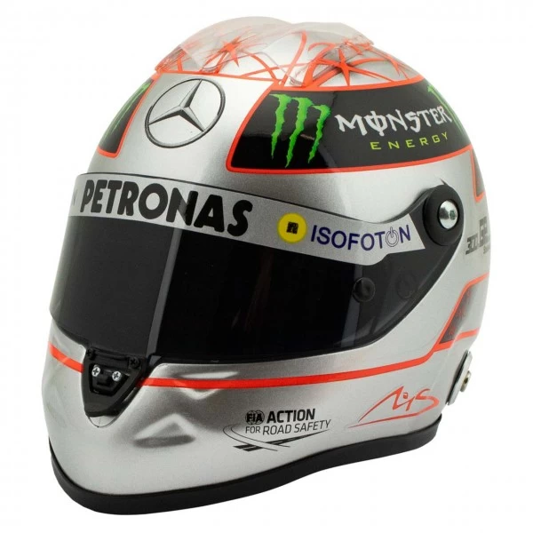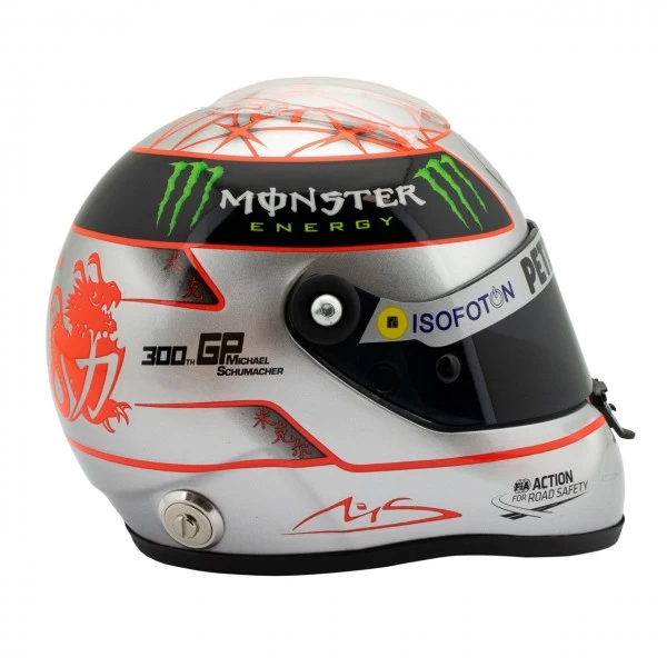 Michael Schumacher Spa helmet from the year 2012. This helmet design was worn by Michael Schumacher at his 300 Formula 1™ Grand Prix in 2012. At this time Schumacher already had 91 victories and 7 World Champion titles. In Spa Michael Schumacher celebrated numerous great moments and racing successes.