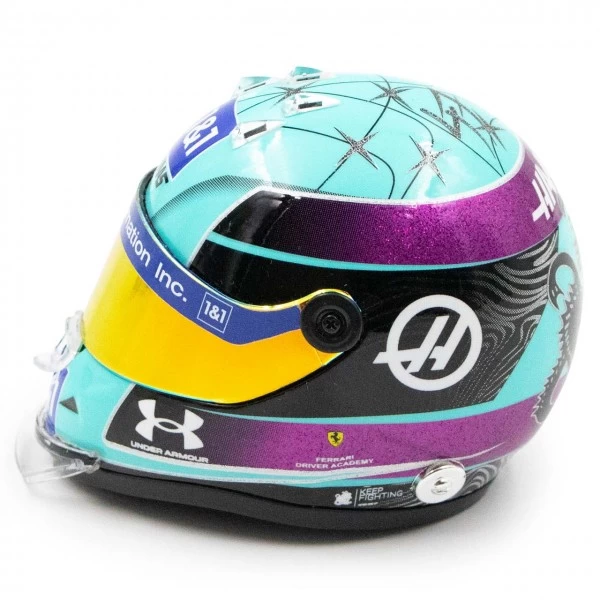 Mick Schumacher drove with this helmet for the Haas F1 Team from the Miami GP 2022. The paintwork in the main colours of turquoise and purple reflects the maritime theme of the Formula 1 race on the American east coast. This helmet will also be a special memory for Mick, as he scored his first Formula 1 World Championship points with the same design at the race in Silverstone and at the Austrian Grand Prix.
