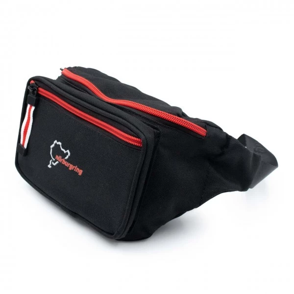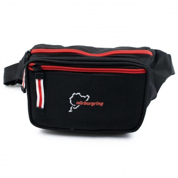 The “Pole Position” fanny pack in black from the Nürburgring fan collection features the Nürburgring logo on the front. The jacquard strap with clip closure features the Nürburgring lettering. In addition to the main compartment, there is another side compartment with a zip. The bag is made of easy-care polyester and measures 20 x 13 x 9 cm.