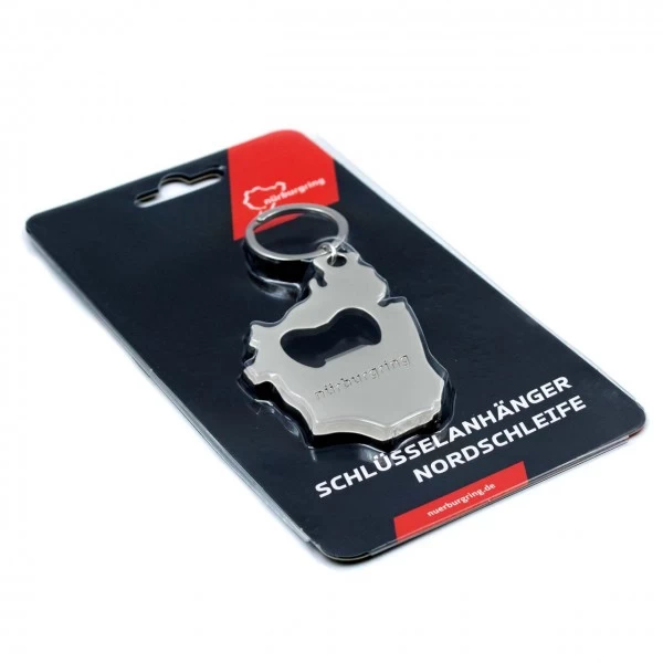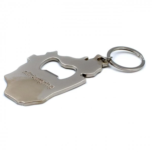 The keyring bottle opener from the Nürburgring fan collection features the Nürburgring lettering engraved on the front and is worked out in the shape of the Nordschleife. The pendant with metal ring has a punched opening in the middle so that it can also be used as a bottle opener.