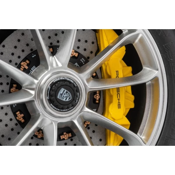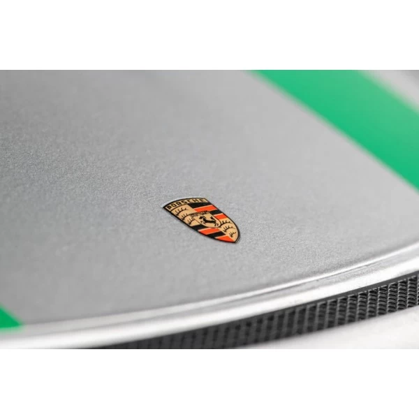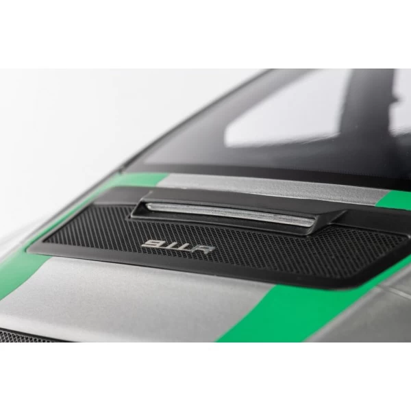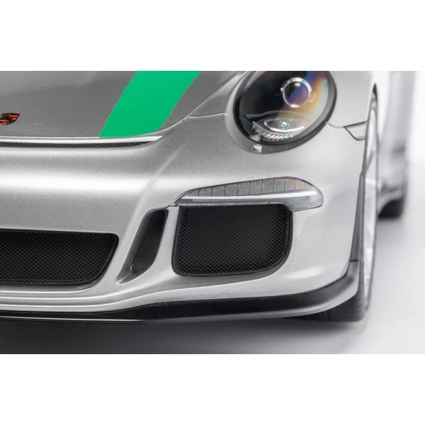 The Porsche 911 (991.1) R – 2016 – model on a scale of 1/8 incl. showcase, colour silver with green decoration.