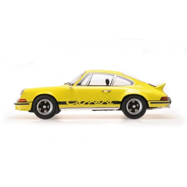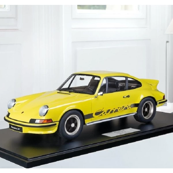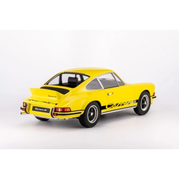 The Porsche 911 Carrera RS 2.7 Lightweight – 1972 model on a scale of 1/8 incl. showcase, colour yellow with black decoration.