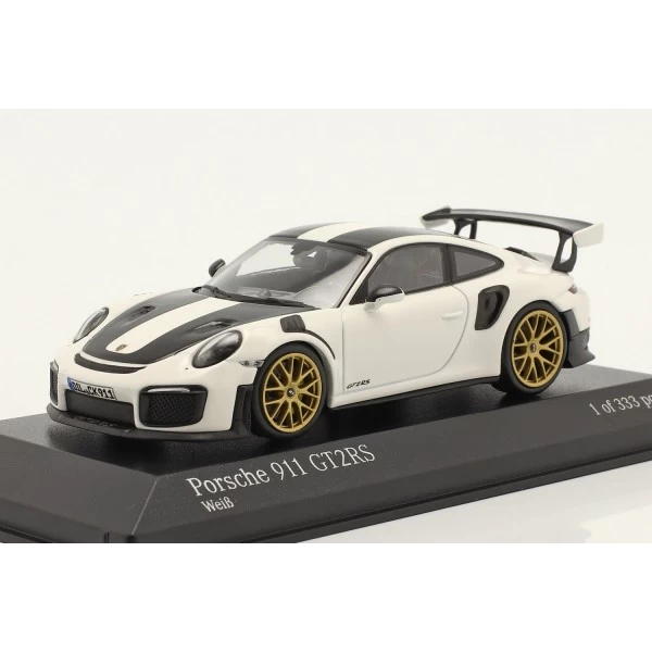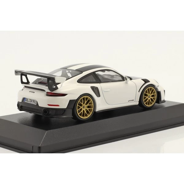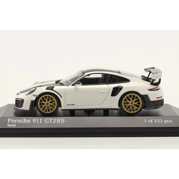 Porsche 911 GT2 RS Weissach Package 2018 1/43 scale model in white with gold rims.