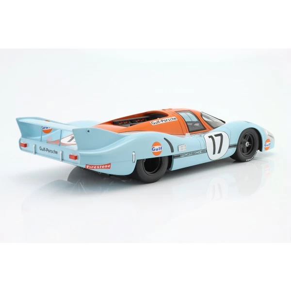 Miniature 1/12 scale model of the Porsche 917 LH #17 from the John Wyer Automotive Engineering team with drivers Joseph Siffert and Derek Bell. The team drove this car in the LeMans 24-hour race in 1971.