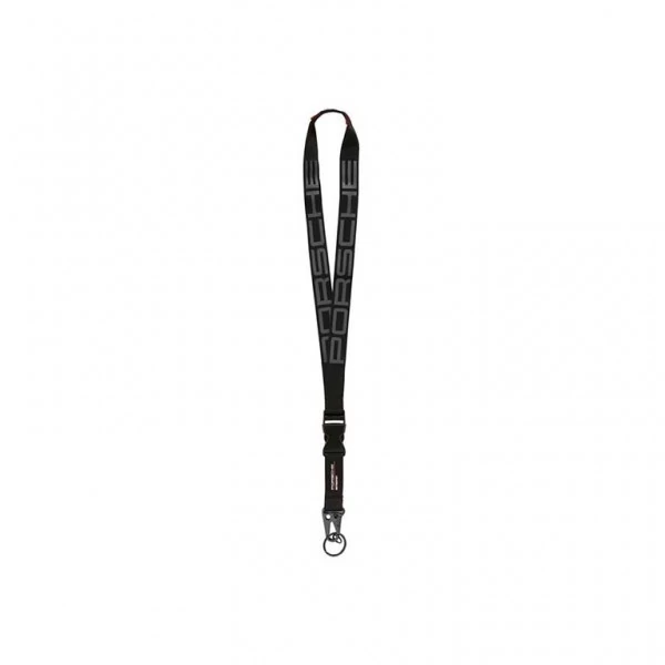 Black lanyard with Porsche and Porsche Motorsport logo. The lanyard has a metal clip with a ring attachment, which makes it quick and easy to attach keys, for example.