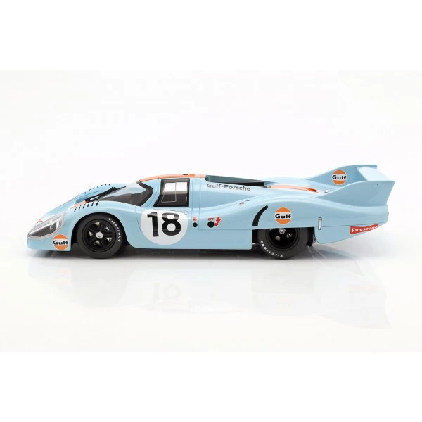 Miniature 1/18 scale model of the Porsche 917 LH #18 from Team John Wyer Automotive Engineering with drivers Pedro Rodriguez and Jackie Oliver. With this vehicle the team drove in the 24h race of LeMans in 1971.
