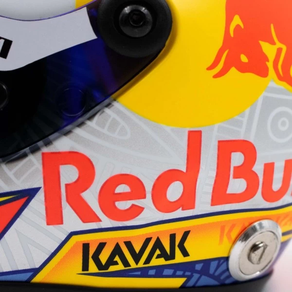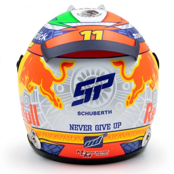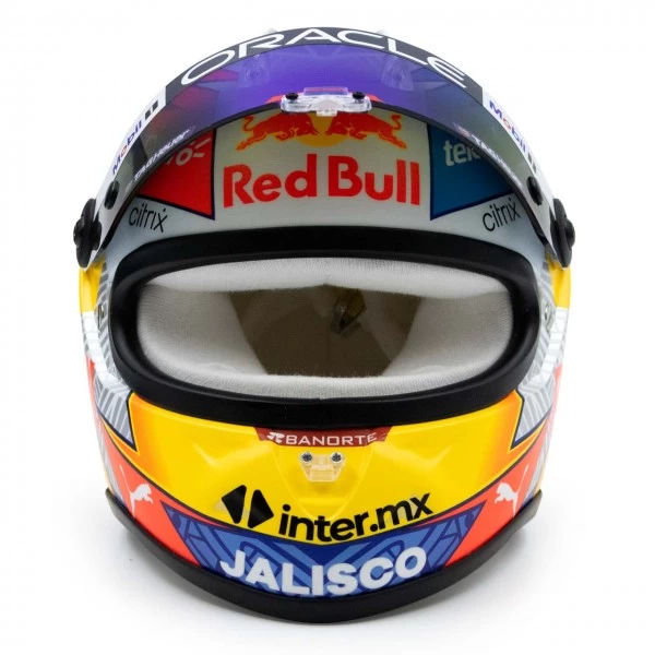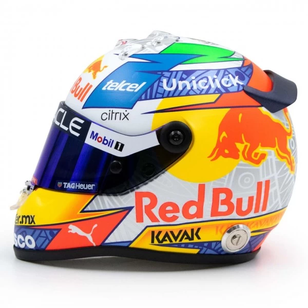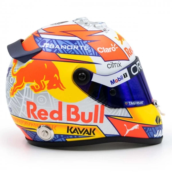 The miniature helmet in 1/2 scale is a faithful replica of the driver’s helmet of Sergio Pérez from the Oracle Red Bull Racing Team from the Formula 1 season 2022.