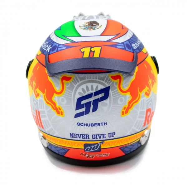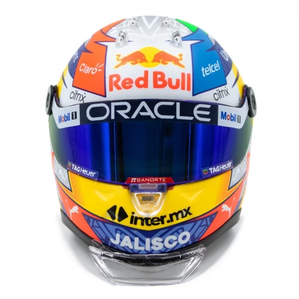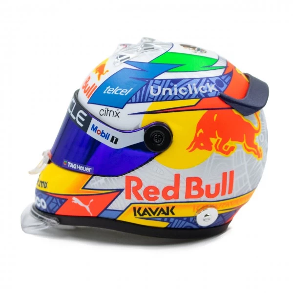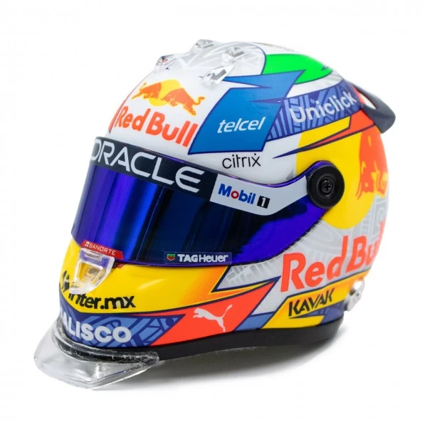 The miniature helmet in 1/4 scale is a faithful replica of the driver’s helmet of Sergio Pérez from the Oracle Red Bull Racing Team from the Formula 1 season 2022.