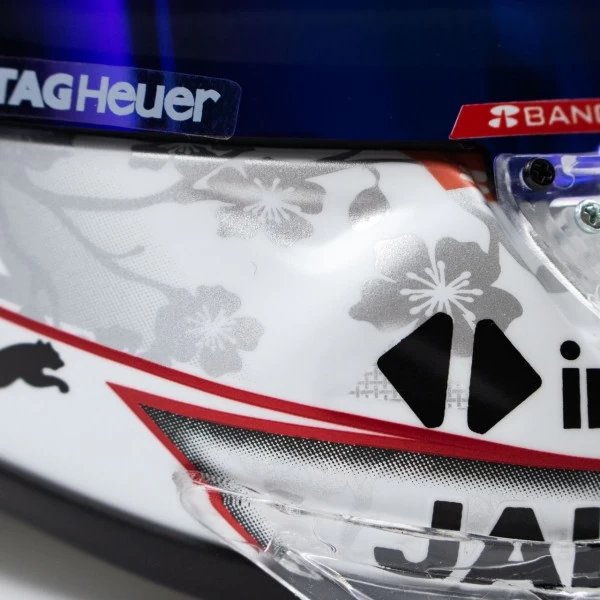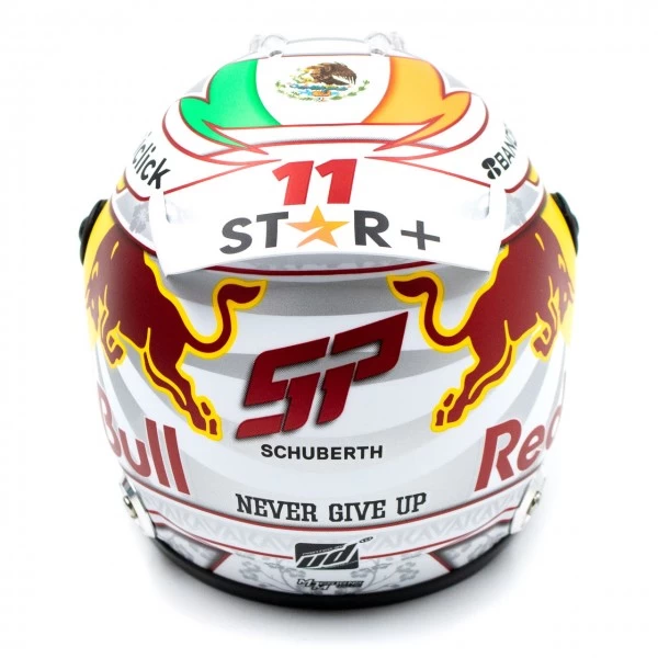 The miniature helmet in 1/2 scale is a faithful replica of the driver’s helmet of Sergio Pérez from the Oracle Red Bull Racing Team from the Formula 1 season 2022, which he wore during the Japanese Grand Prix.