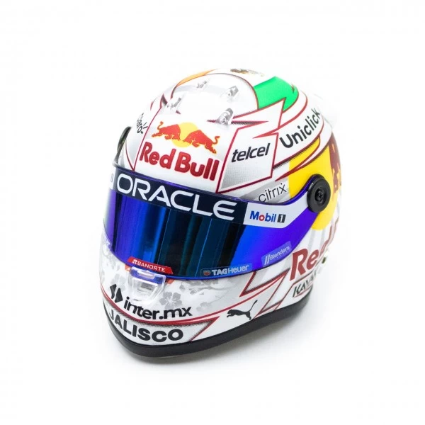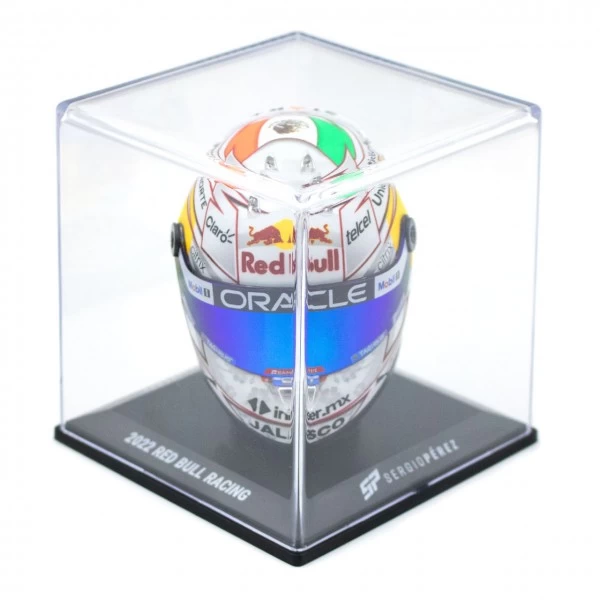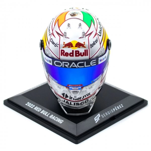 The 1/4 scale miniature helmet is a faithful replica of the driver’s helmet worn by Sergio Pérez of the Oracle Red Bull Racing Team during the 2022 Formula 1 season at the Japanese Grand Prix.