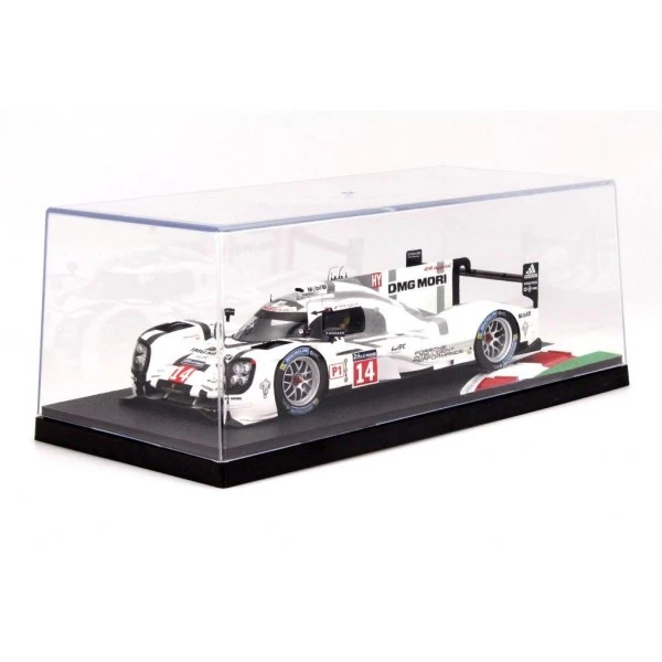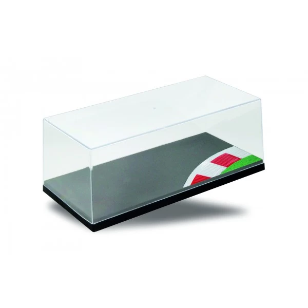 High-quality showcase for model cars in 1/18th scale. The showcase in racetrack design with a curb protects your collectors’ items from dust and damage.